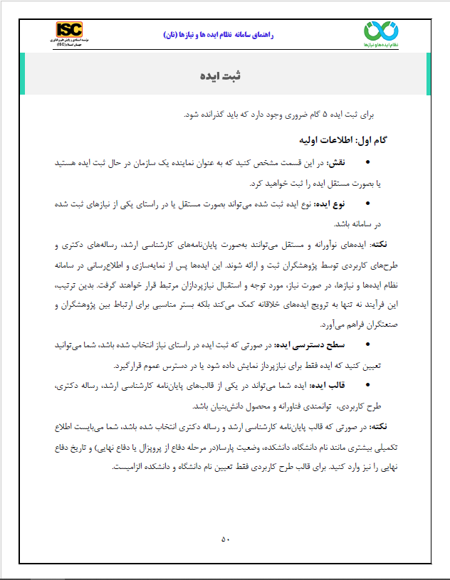 در این چارچوب، تأکید میشود دانشجویان محترم ترجیحاً ایدههای خود را با هدایت و از طریق اساتید راهنمای عضو هیئت علمی در سامانه ثبت کنند، چرا که این شیوه میتواند شانس بررسی دقیقتر، پذیرش ایده و در نهایت انعقاد قرارداد را بهطور قابل توجهی افزایش دهد و از منظر حقوقی و علمی نیز مسیر مطمئنتری را فراهم سازد.