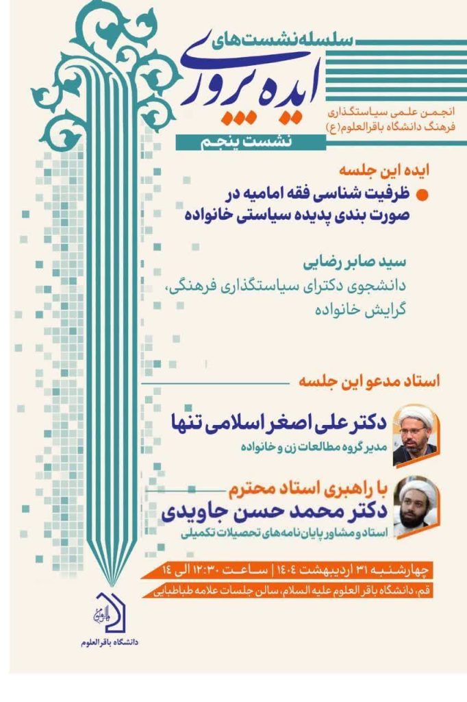 انجمن علمی سیاستگذاری فرهنگی با همکاری انجمن مطالعات زوجیت و فرهنگ دانشگاه باقرالعلوم(ع) برگزار میکند؛