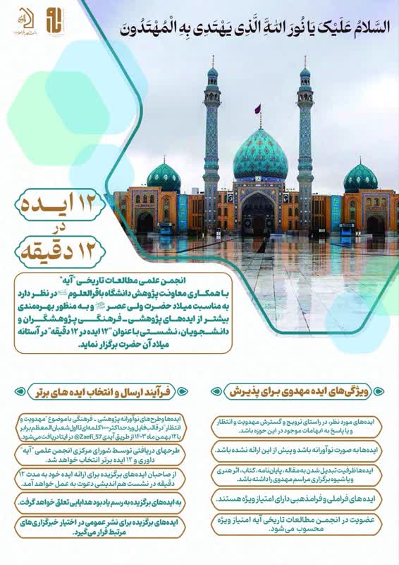 انجمن علمی مطالعات تاریخی «آیه» با همکاری اداره پژوهش دانشگاه باقرالعلوم علیه السلام در نظر دارد به مناسبت میلاد حضرت ولی عصر عجل الله تعالی فرجه الشریف و به منظور بهرهمندی بیشتر از ایدههای پژوهشی ـ فرهنگی پژوهشگران و دانشجویان، نشستی با عنوان «۱۲ ایده در ۱۲ دقیقه» برگزار نماید.