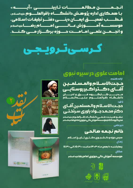 انجمن مطالعات تاریخی «آیه» با همکاری اداره پژوهش دانشگاه باقرالعلوم(علیهالسلام) و قطب تعمیق ایمان دینی دفتر تبلیغات اسلامی و موسسه آموزش عالی امام رضا(علیهالسلام) و انجمن علمی امامت حوزه، کرسی ترویجی امامت علوی در سیره نبوی برگزار می کند.