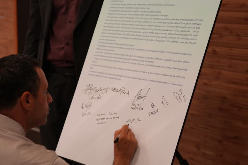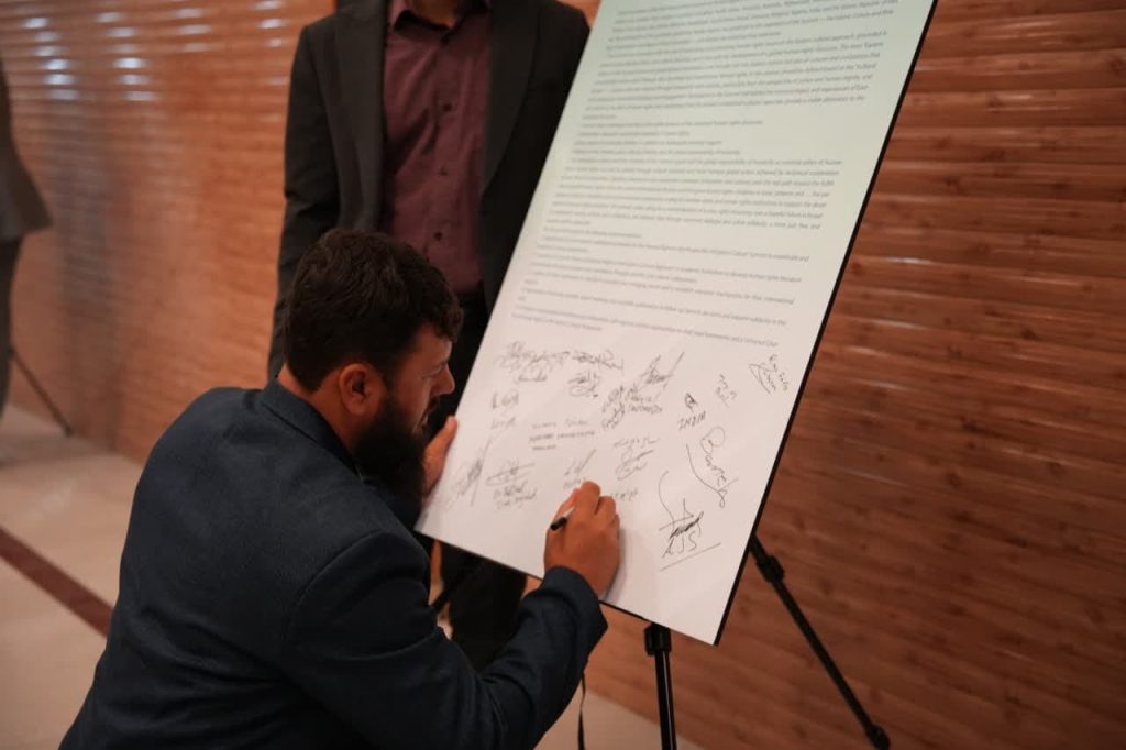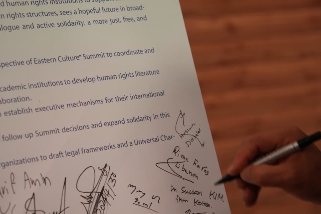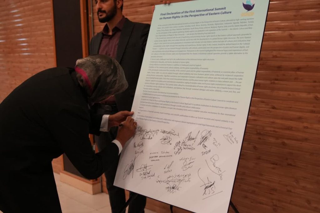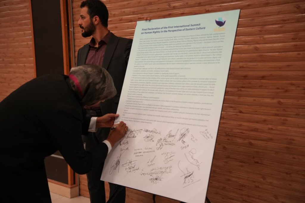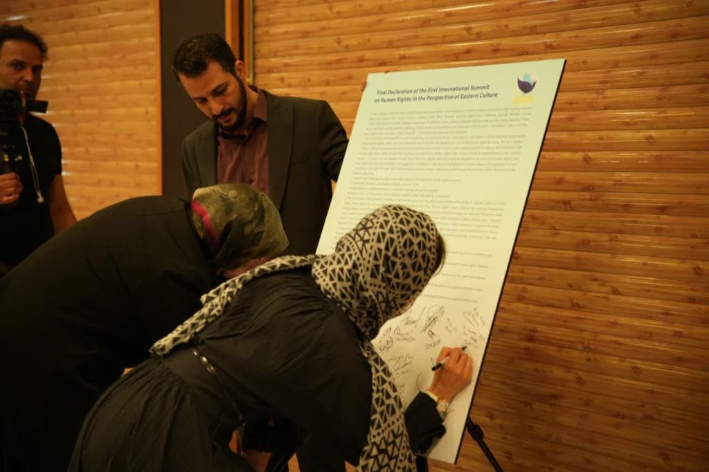 در پایان نخستین اجلاس بینالمللی حقوق بشر در رهیافت شرقی، مهمانان و شرکت کنندگان در این همایش، بیاینه پایانی را امضاء کردند.