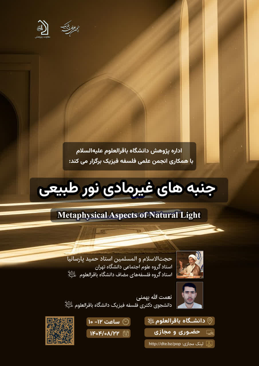 نشست علمی «جنبههای غیرمادی نور طبیعی» در دانشگاه باقرالعلوم(ع) برگزار شد و اساتید حاضر با بررسی ویژگیهای غیرجسمانی نور، آن را حلقهای میان عالم ماده و تجرد دانستند. در بخش فلسفی نیز تأکید شد که یافتههای فیزیک جدید میتواند به بازتعریف مفهوم مادّه در حکمت اسلامی بینجامد.