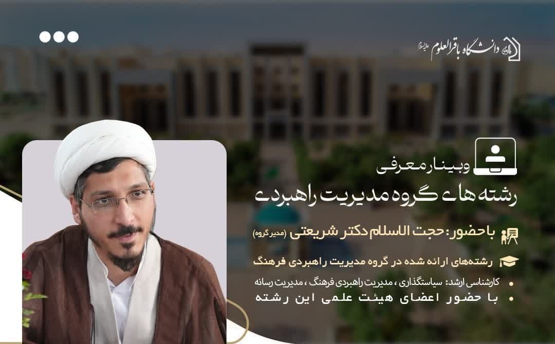 وبینار معرفی گروه «مدیریت راهبردی» شامل رشتههای مدیریت رسانه، سیاستگذاری فرهنگی، مدیریت راهبردی فرهنگ با حضور دکتر حجت الاسلام محمدهادی شریعتی برگزار میشود.