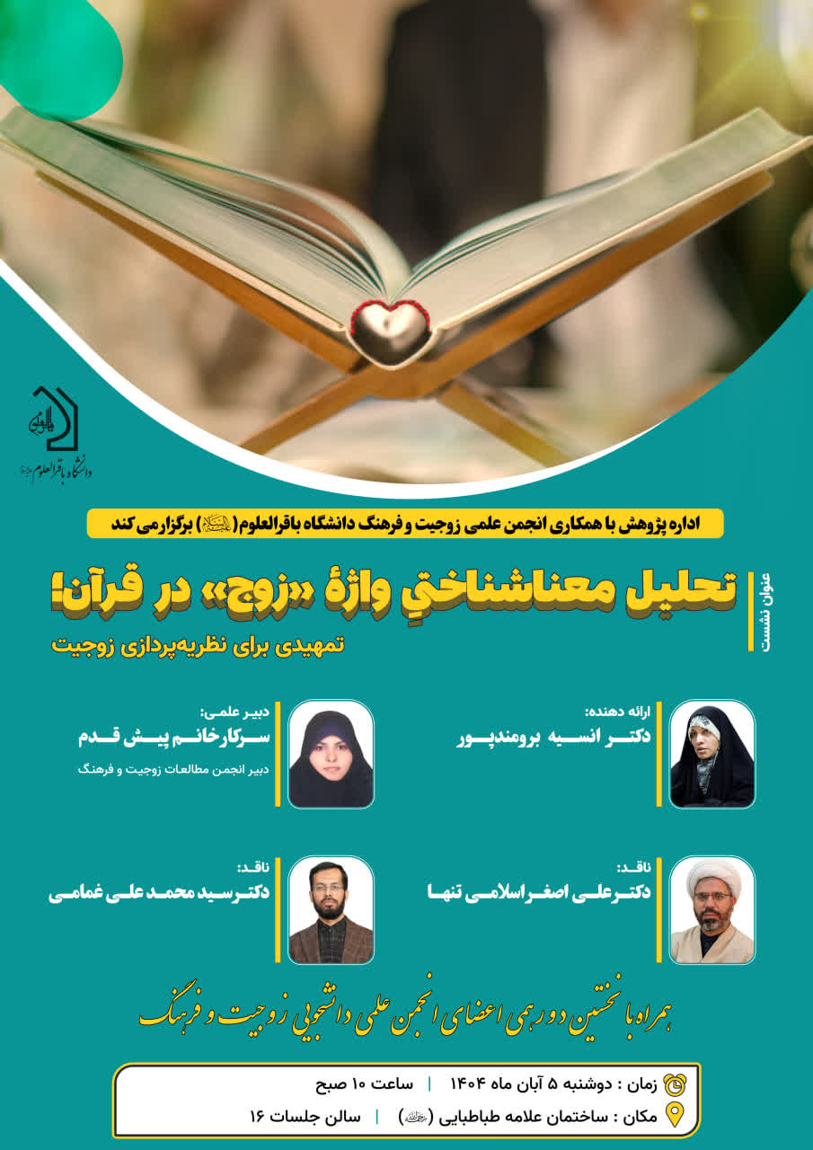 به همت اداره پژوهش و با همکاری انجمن علمی مطالعات زوجیت و فرهنگ دانشگاه باقرالعلوم(ع)، کرسی ترویجی با عنوان «تحلیل معناشناختیِ واژهٔ زوج در قرآن؛ تمهیدی برای نظریهپردازی زوجیت» برگزار خواهد شد. در این نشست علمی، دکتر انسیه برومندپور به عنوان ارائهدهنده، به بررسی ریشهها و لایههای معنایی واژهٔ «زوج» در قرآن خواهد پرداخت و […]