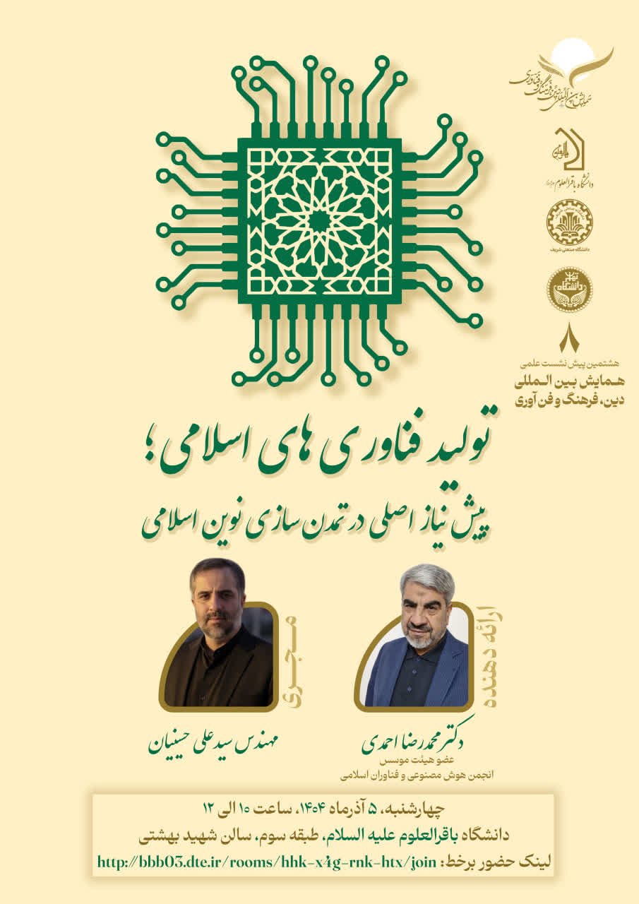 پیشنشست علمی همایش «دین، فرهنگ و فناوری» با موضوع «تولید فناوریهای اسلامی؛ پیشنیاز تمدنسازی نوین اسلامی» روز چهارشنبه ۵ آذر، ساعت ۱۰ صبح در سالن شهید بهشتی دانشگاه باقرالعلوم(ع) برگزار میشود.