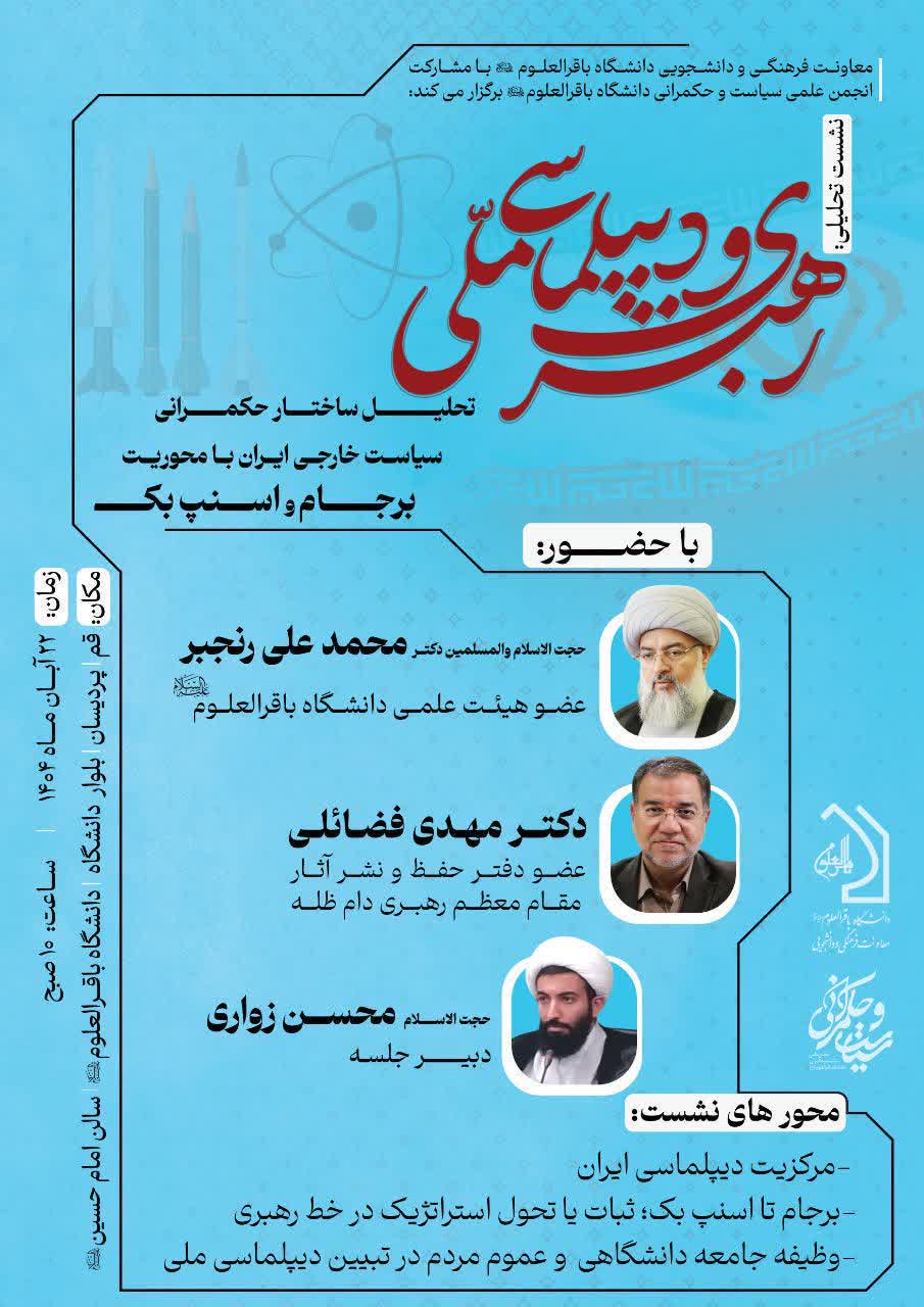 به گزارش روابط عمومی دانشگاه باقرالعلوم(ع)، نشست علمی با عنوان «رهبری و دیپلماسی ملی» صبح روز پنجشنبه ۲۲ آبانماه ۱۴۰۴ به همت معاونت فرهنگی و دانشجویی دانشگاه و با مشارکت انجمن علمی سیاست و حکمرانی در سالن امام حسین(ع) برگزار شد. در این نشست، حجتالاسلام والمسلمین دکتر محمدعلی رنجبر، عضو هیئت علمی دانشگاه باقرالعلوم(ع)، و […]